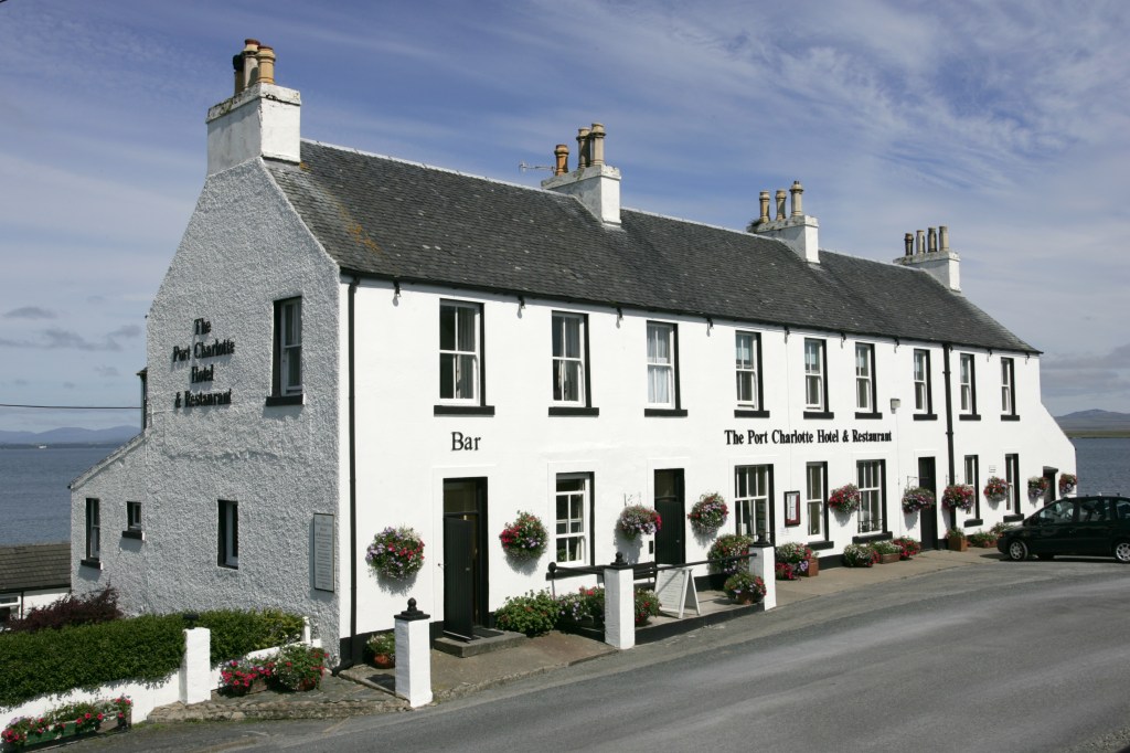 A comfortable, family run hotel, bar and a’la carte restaurant with 10 en-suite bedrooms located in the centre of an attractive conservation village. Port Charlotte village, built around 1830, is a small hamlet of whitewashed stone houses and sits on the west shore of Loch Indaal. There are lovely sea views with fine dining and bar meals, a comfortable residents’ lounge, conservatory and patio area overlooking the bay, and access to the sandy beach. Diners can also choose to eat in the conservatory or bar with bistro-style meals. The public bar sometimes hosts live music sessions featuring Celtic tunes and folk music and singing. Dogs welcome in bedrooms.