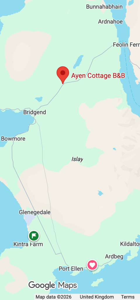 Ayen Cottage is a small family run bed and breakfast offering comfortable accommodation in one of the more rural parts of Islay, approximately 5 miles from Port Askaig ferry terminal. (Please note there is a steep track up to the house.) When staying at Ayen Cottage you’ll be staying with Carole and Barry who have been welcoming Islay visitors for many years and have helped them to discover the many wonders to be found on the island.