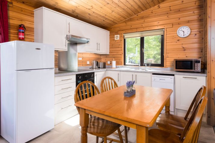 All lodges have an open-plan lounge, dining area and kitchen. The lounge has French doors to a sheltered timber deck area with garden furniture. The kitchen has a dishwasher, fridge/freezer, electric oven and hob, microwave and a full range of cutlery, crockery and cooking utensils.