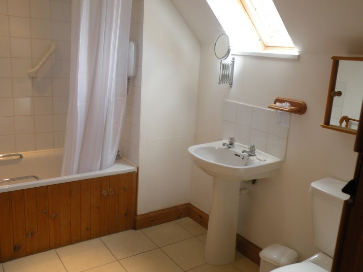 Separate cloakroom with toilet and wash basin downstairs and an upstairs bathroom with bath and electric overhead shower.