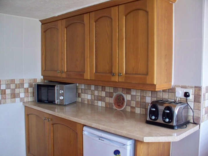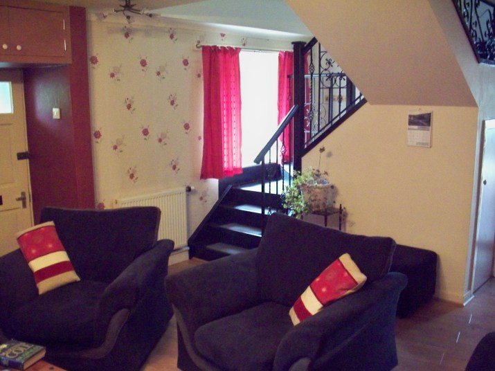 The kitchen is equipped with electric cooker, dishwasher, fridge with freezer compartment, microwave and plenty of worktop and cupboard space. There is a washing machine and tumble dryer in the utility room.The lounge has feature fireplace with log-burning stove, seating for 5 including a sofa bed, dining table & chairs, Sky TV, DVD and free Wi-fi access. The bathroom has a bath with overhead thermostatic shower. From the lounge, a wrought iron staircase leads to the 2 bedrooms upstairs – one with a double bed and the other a single bed. Bedrooms are small but adequate.